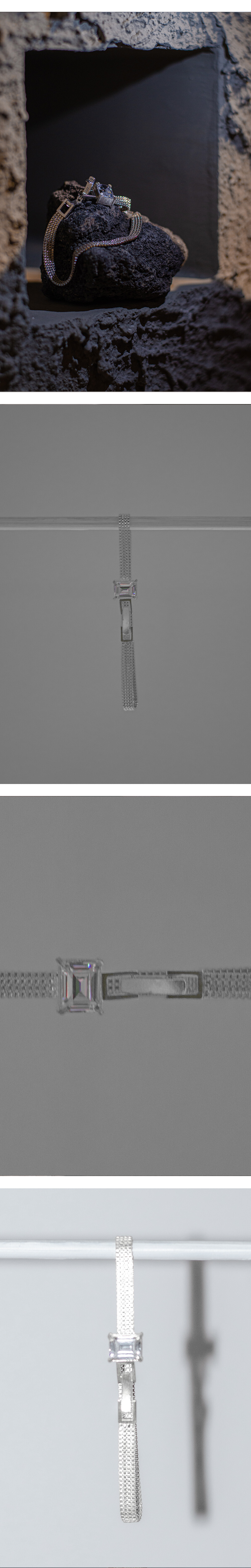 시계밴드와 흡사한 모양새를 가진 체인과 매끈한 잠금장치로 날카롭고 예민한 분위기를 냅니다.