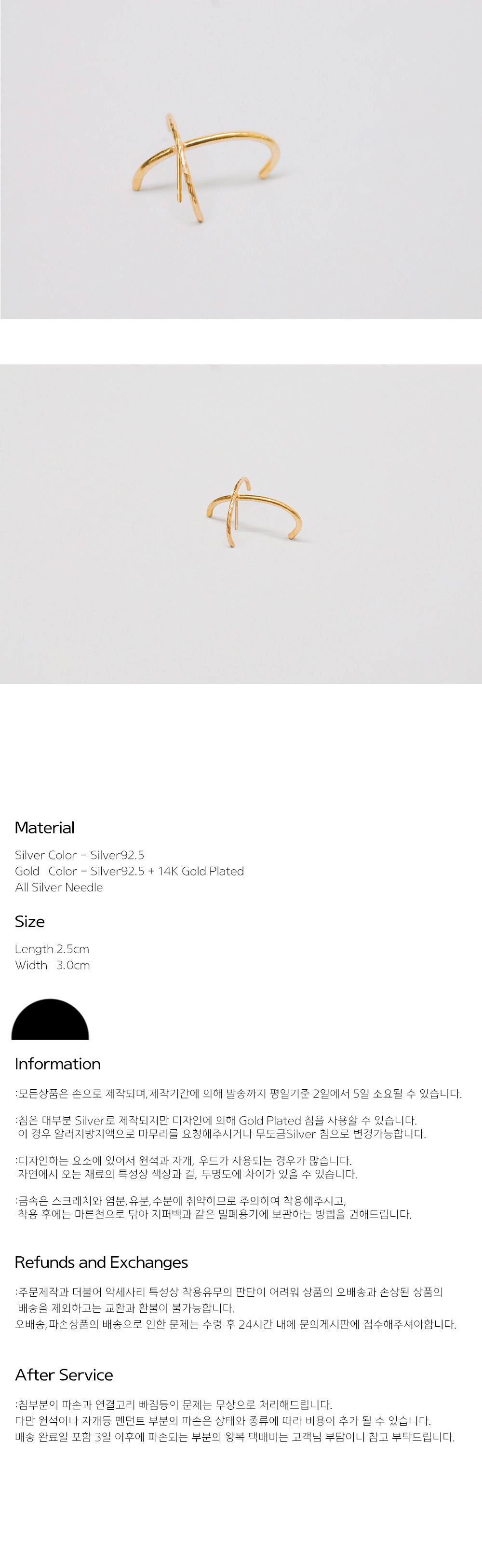 한쪽만 착용할 수 있게 제작한 귀걸이입니다. 이어커프처럼 귓불을 모두 감쌀 수 있게 제작되었지만 중앙부분에 귀걸이 침이 붙어있어 보다 안정감있게 착용이 가능합니다. 십자 형태를 하고 있고 교차하는 두 라인을 다른 형태의 실버바로 제작해 더 독특한 분위기를 가지고있습니다.