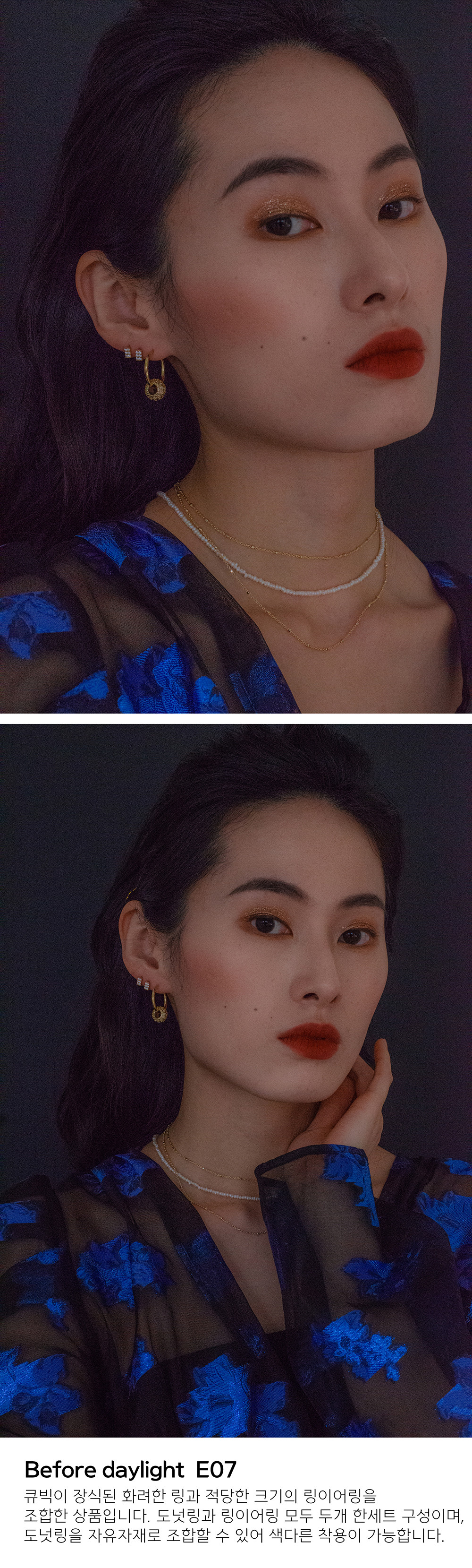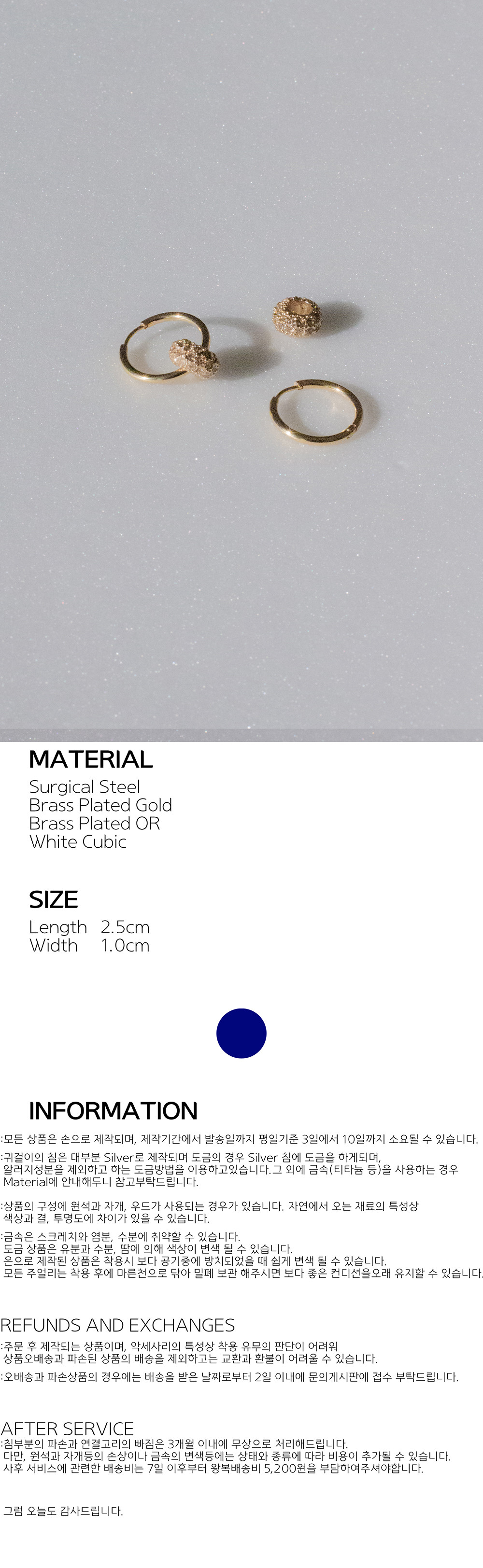 기본 링이어링과 반짝이는 큐빅볼을 조합한 상품입니다. 큐빅볼은 골드색상과 은은하게 어우러지는 브라운빛을 띄며 , 실버컬러의 이어링에는 화이트 스톤이 들어간 큐빅볼로 보내드립니다.