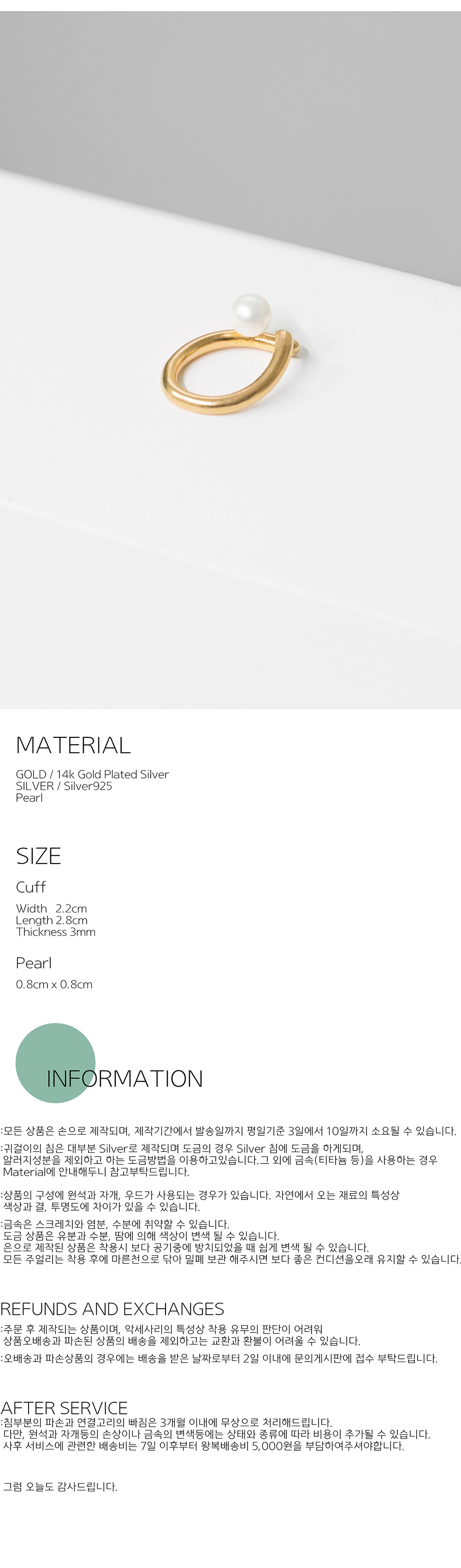 "Flower's Earcuff04"는 볼드하고 묵직한 분위기의 진주이어커프 입니다.진주쪽을 뒷쪽으로 착용하여 다른 분위기를 연출 할 수 있습니다. 선 자체가 두껍고 하나만으로도 포인트가 되기에 충분합니다. 틈을 조정하는데에 손의 힘이 많이 필요하지만 한번 본인의 귀에 맞게끔 조정해놓고 착용하시길 권해드립니다.