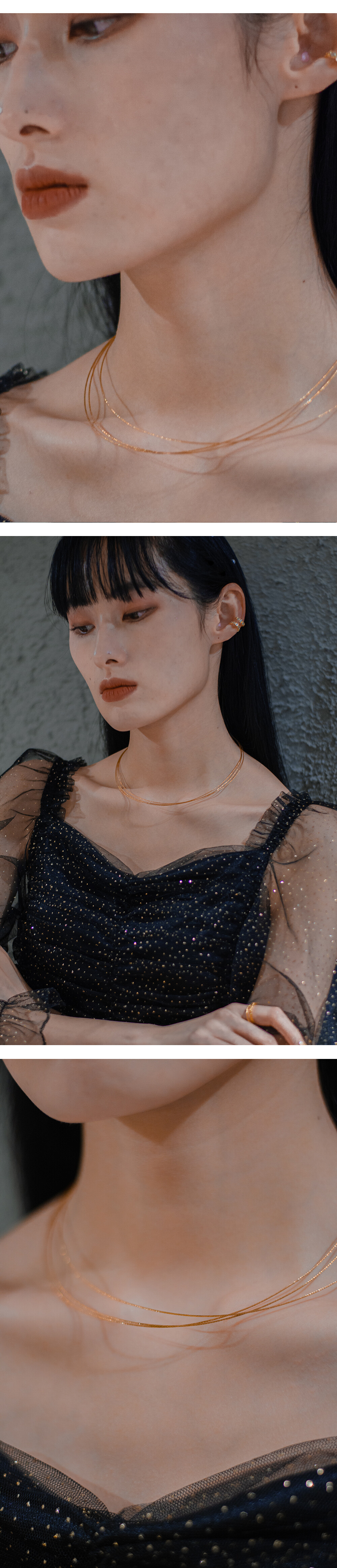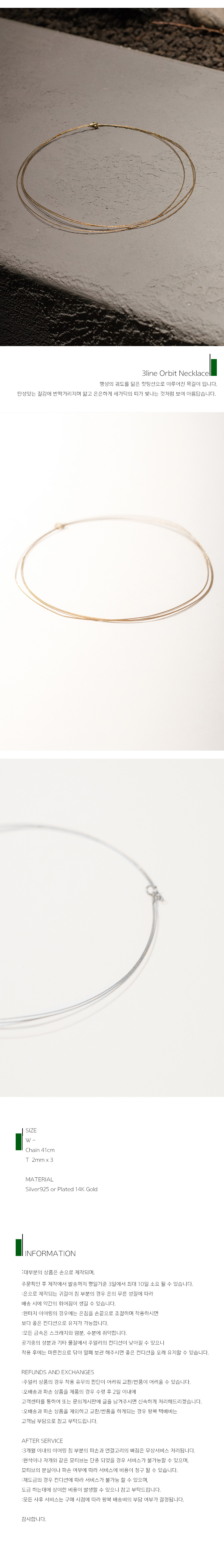 For your good choice -세개의 궤도를 표현한 둥글고 탄성이 있는 넥클레이스입니다. -세개의 은 선이 모두 컷팅으로 빛나게 제작되어 은은하게 반짝입니다. -추운 날에는 목까지 감싸는 타이트한 니트와 함께 , 더운 날에는 넥 라인이 깊은 옷과 매치하면 좋을 것 같습니다. -실루엣이 큰 옷 보다는 타이트하고 최대한 간결한 실루엣과 매치할 때 가장 아름답다고 느껴집니다.