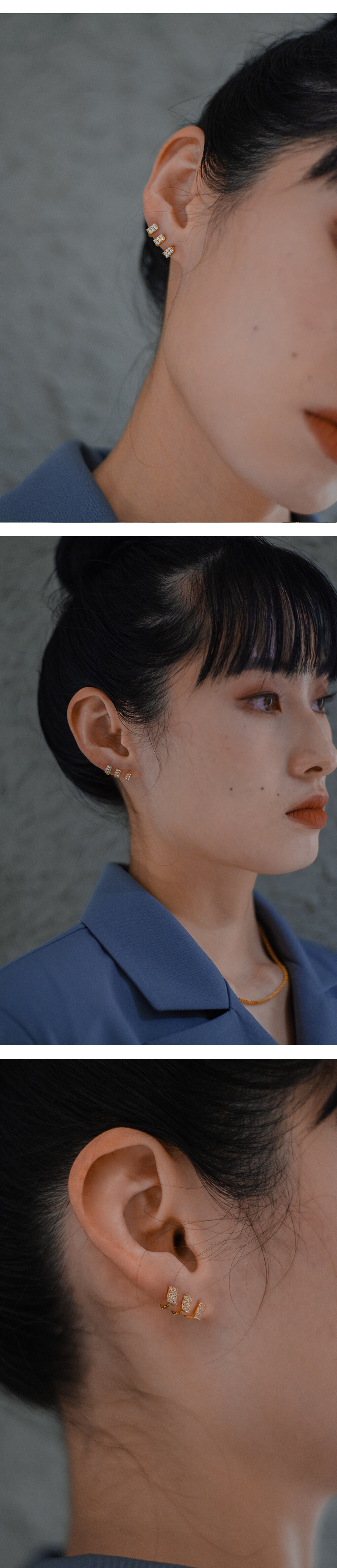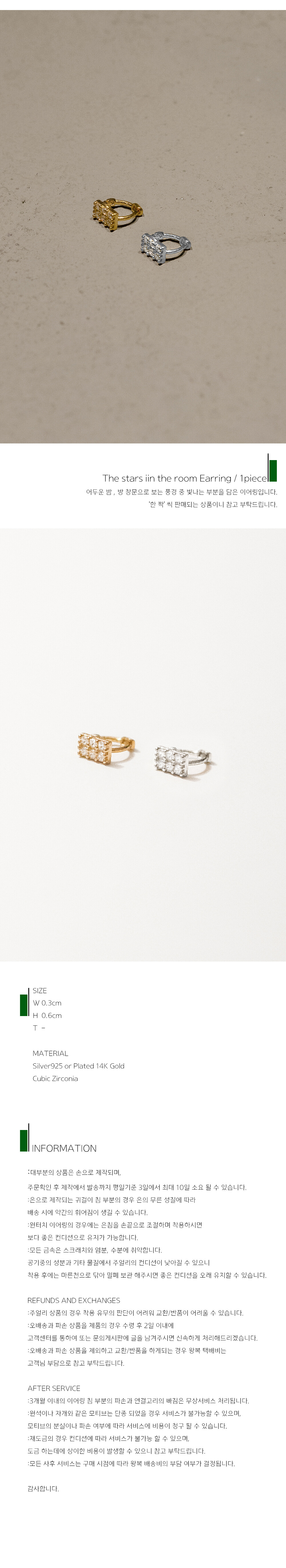 For your good choice -작은 사각형 안에 여섯개의 지르콘 큐빅이 세팅되어있습니다. -작지만 반짝거리고 네모난 틀 안에 있는 형태가 창문으로 보는 별빛 같아, 이름은 '방 안에서 보는 별'입니다. -두꺼운 귓불에는 적합하지 않을 수 있으며 사이드 타입으로 더 추천드립니다. -심플한 메인 이어링과 함께하면 단조로움 사이에 포인트를 줄 수 있고 팬시한 이어링과 함께 해도 좋을 것 같습니다. -한쪽 귀를 여러개 뚫으셨다면 여러개를 한쪽 귀에 착용하는것도 멋스러울 것 같습니다.