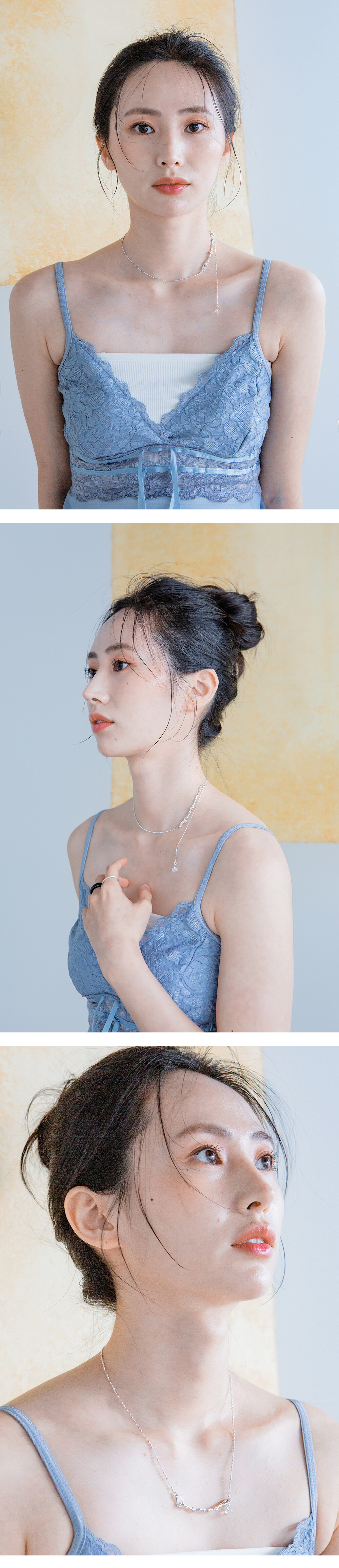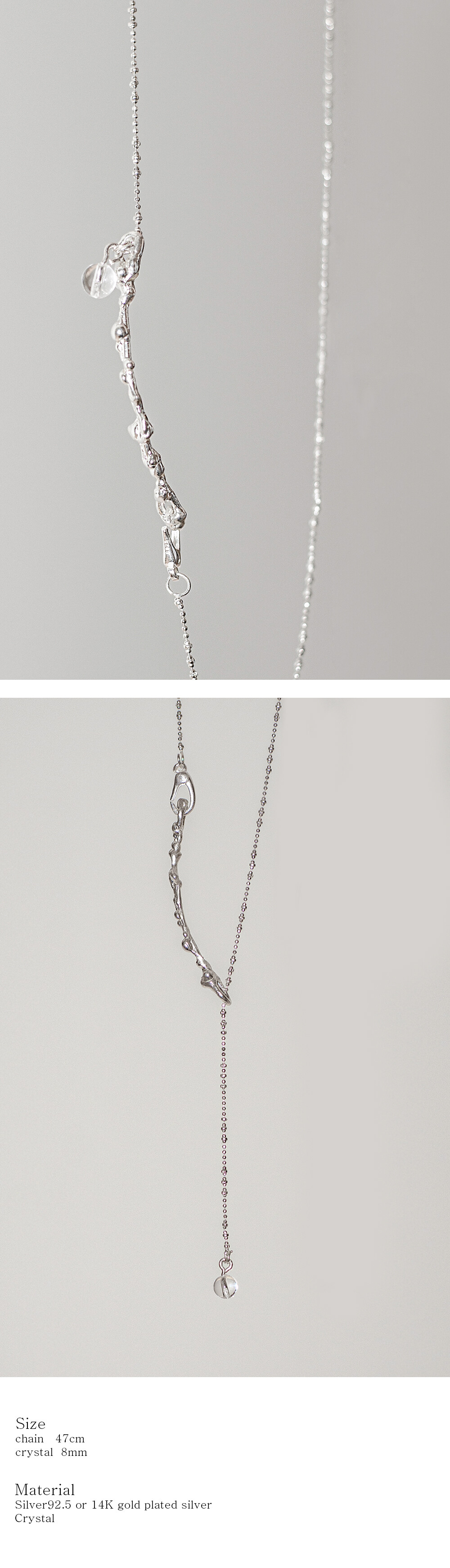 반짝이는 체인과 수정이 빛을 머금는 목걸이 입니다. 잠금장치로 체인을 잠그고 수정이 달린 체인을 통해 길이를 조정해 아주 다양한 연출을 할 수 있습니다.