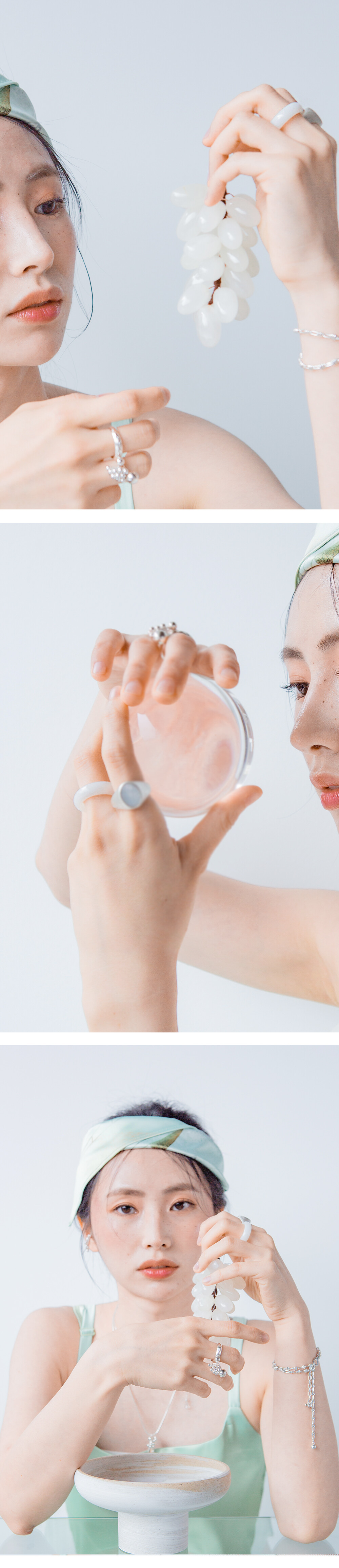 반투명한 색감의 원석 자체를 깎아 반지의 형태로 다듬었습니다. 아주 약간의 차이지만 핑크톤과 블루톤 중에 선택 가능하며 아쉽게도 사이즈 선택을 불가합니다.