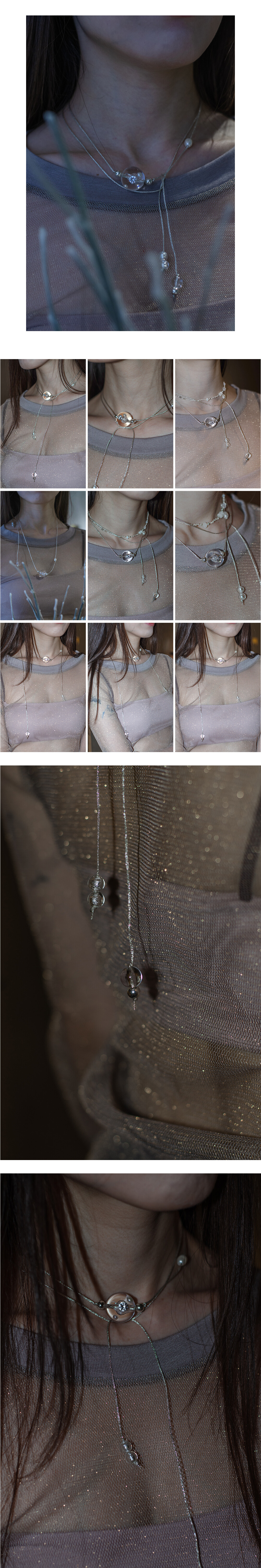 따뜻한 공기와 빛이 사라지지 않는 공간, 상상속의 이 공간은 해가 아주 길고 차갑지 않은 바람과 해변, 반짝이는 모래사장이 존재합니다. 해변과 이어진 수풀과 수풀을 지나면 만나는 투명한 민트 빛깔의 고요한 호수에는 투명한 자갈과 연보라색 금붕어, 그리고 경계가 없는 하늘과 땅이 마주하고 있습니다. - 투명한 아크릴 볼을 직접 가공해 펜던트로 제작했습니다. 가운데의 큐빅은 저가의 플라스틱 큐빅이 아닌 보석류와 가장 경도를 흡사하게 제작해 빛의 파장이 넓어 반짝이는 정도가 좋습니다. 마찬가지로 반짝임이 좋은 은사와 실버볼, 글라스를 이용해 마무리 하였으며 오래 착용해 세월의 흔적이 묻어도 귀여운 모양새를 상상하며 제작되었습니다. 총 길이는 85-90cm정도이며 cross neck과 마찬가지로 여러번 두르거나 한번만 묶어 길게 연출하기 좋습니다.