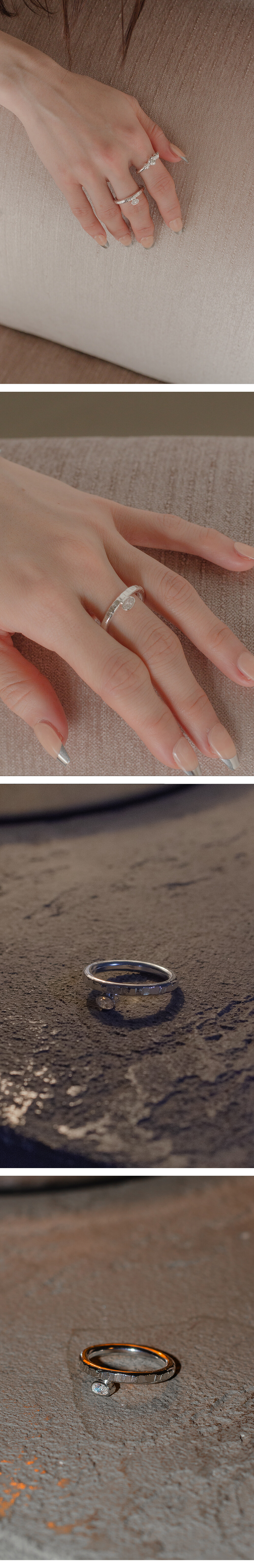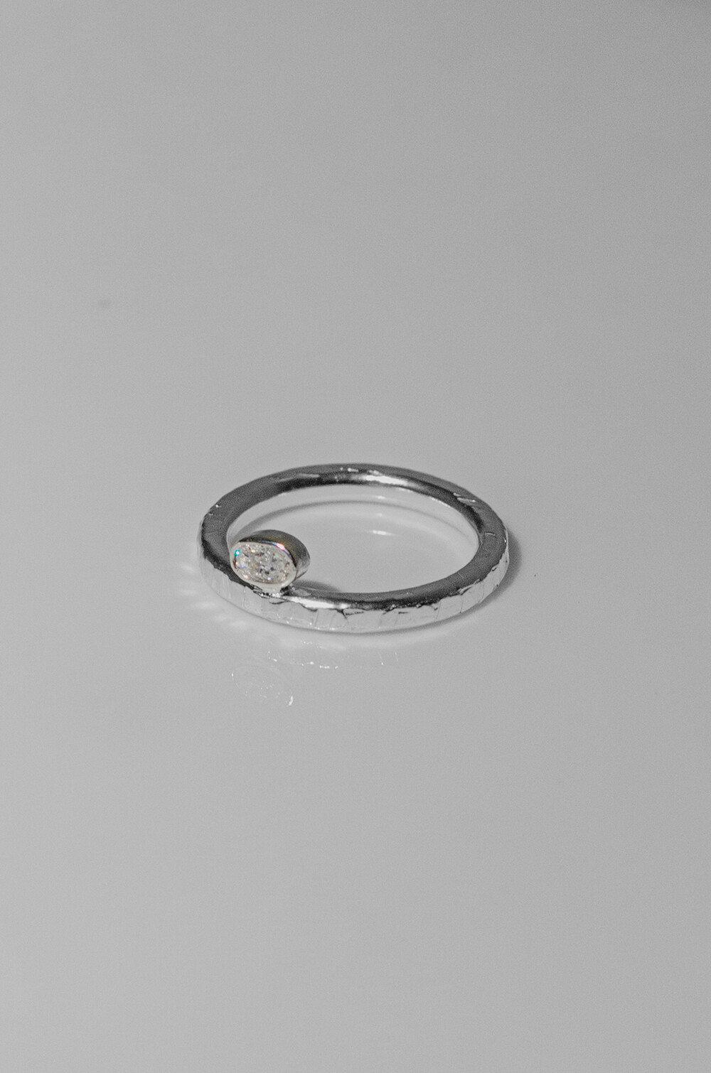 스톤이 따로 손가락 표면에 올라와있는 형태의 반지입니다. 손으로 두드려 질감을 표현한 바디는 표면은 거칠고 투박한 텍스처이며 안쪽은 매끈하고 부드러운 착용감을 느낄 수 있도록 제작했습니다.