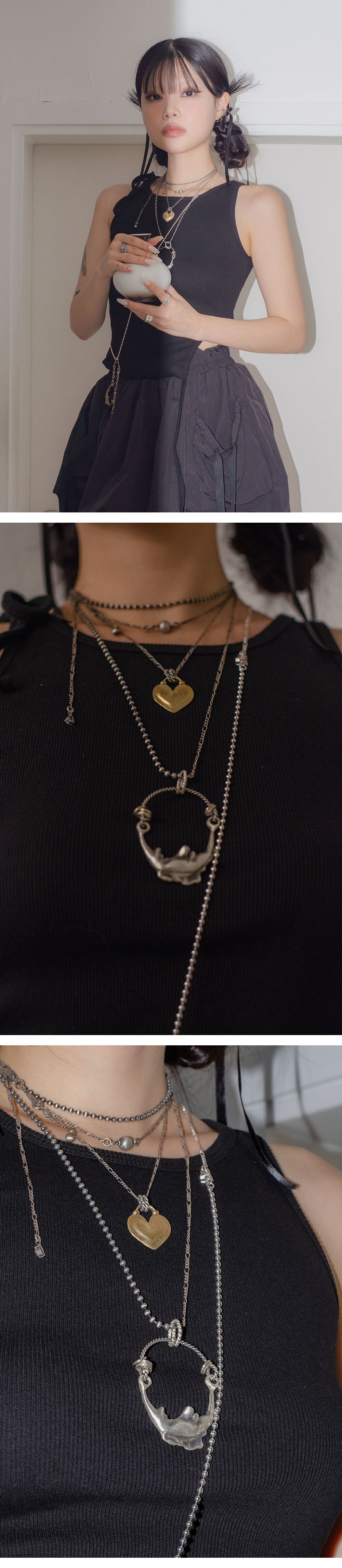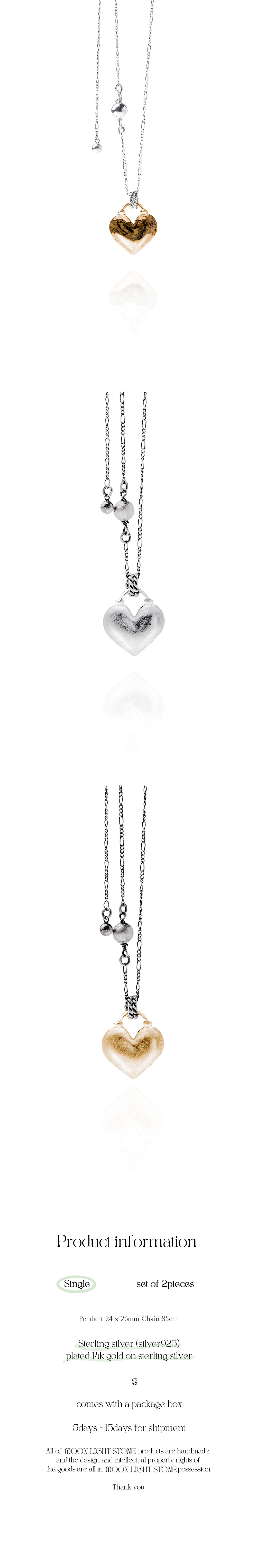 가지고 있을수록 깊은 무드가 묻어나오는 주얼리를 생각하며 제작했습니다. 제작자 개인의 취향은 무광 골드 펜던트와 블랙 체인의 조합을 가장 선호합니다. 장식에 사용된 두개의 은볼은 크기가 다르고 조절한 목걸이 길이에 따라 위치가 달라져 하나의 목걸이로 여러가지 연출을 도와줍니다.
