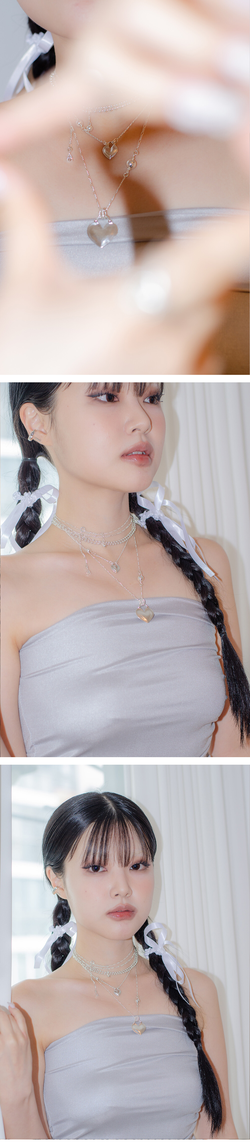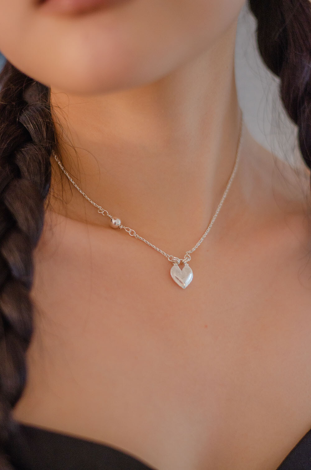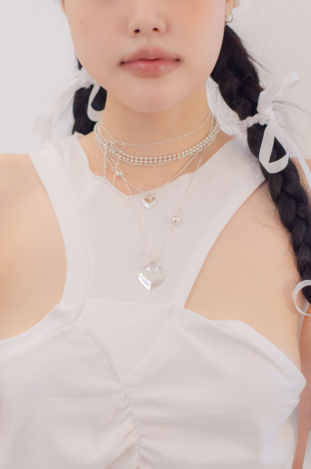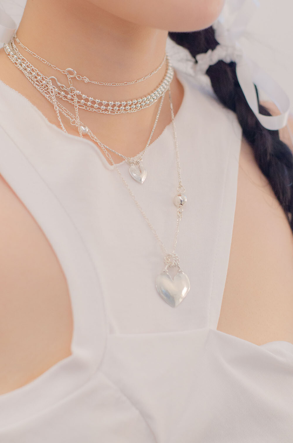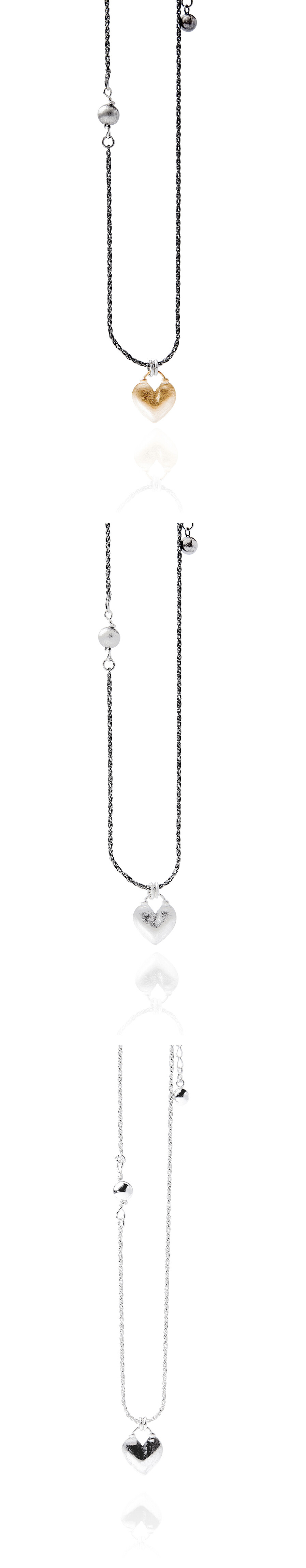 촘촘히 엮인 로프 체인과 엮은 듯이 이어진 볼 포인트, 입체감 있는 형태의 하트 펜던트로 제작 되었습니다. 초커 길이보다는 길지만 쇄골 위쪽으로 올라오는 길이감부터 착용이 가능합니다. (신체의 두께, 넓이에 따라 다름)