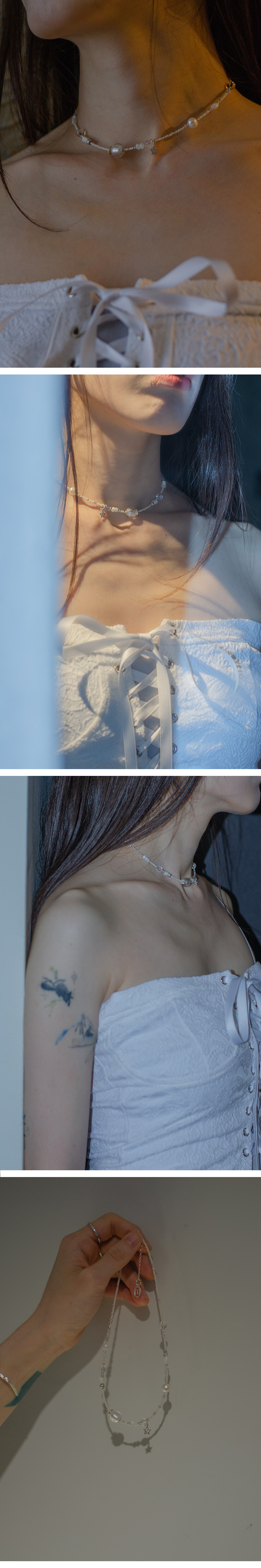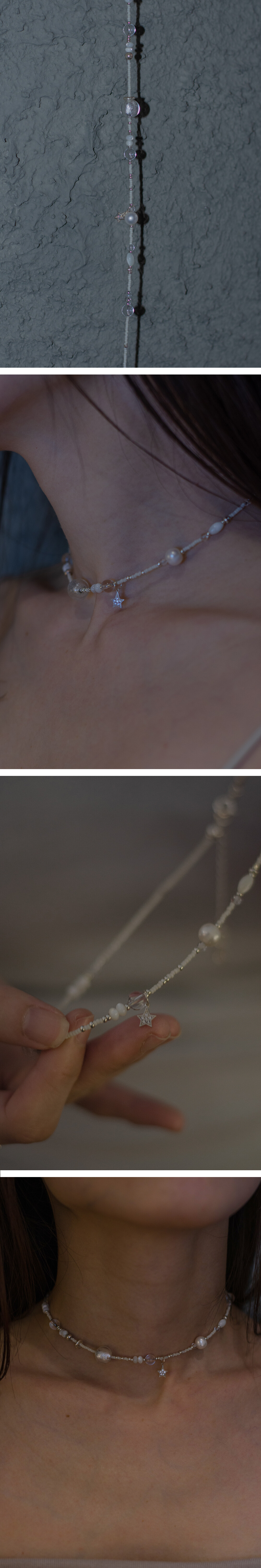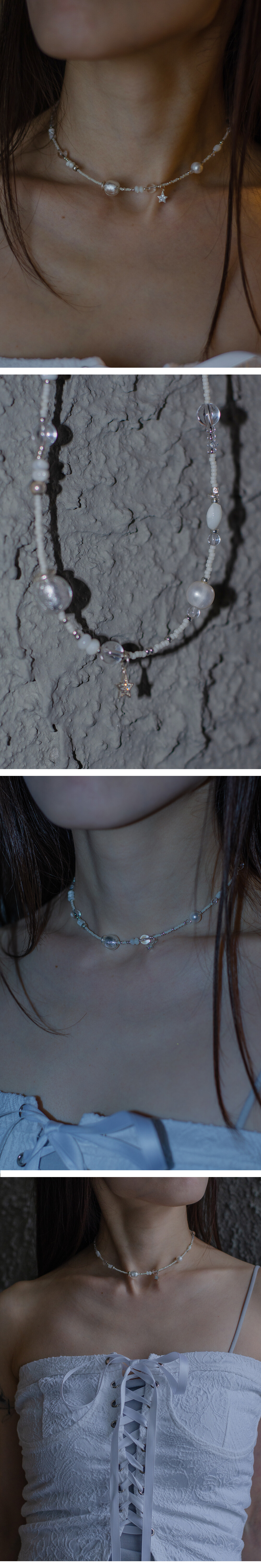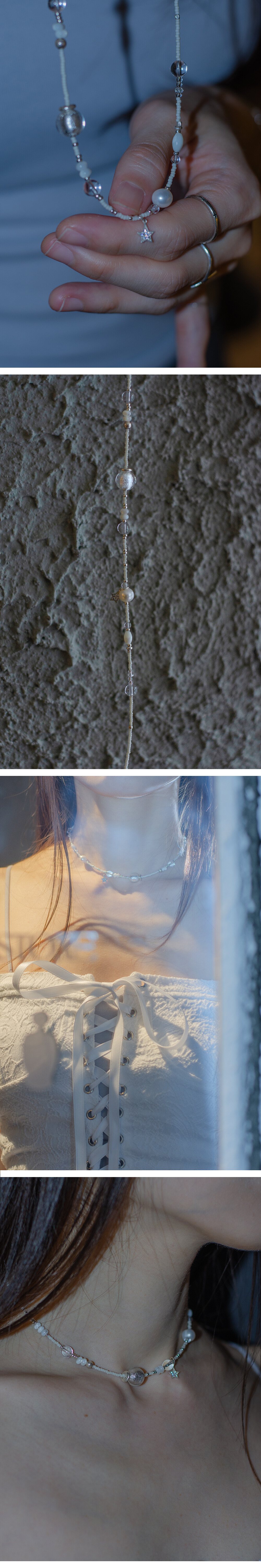 모래알의 반짝임, 밤의 백사장을 상상하며 제작한 목걸이 입니다. 별과 실버 글라스가 반짝반짝, 최대한 채도를 뺀 컬러감으로 제작되었습니다.
