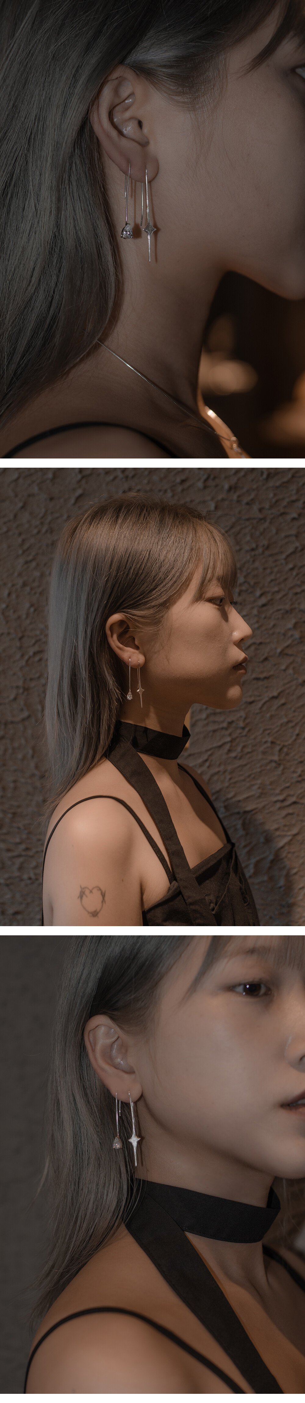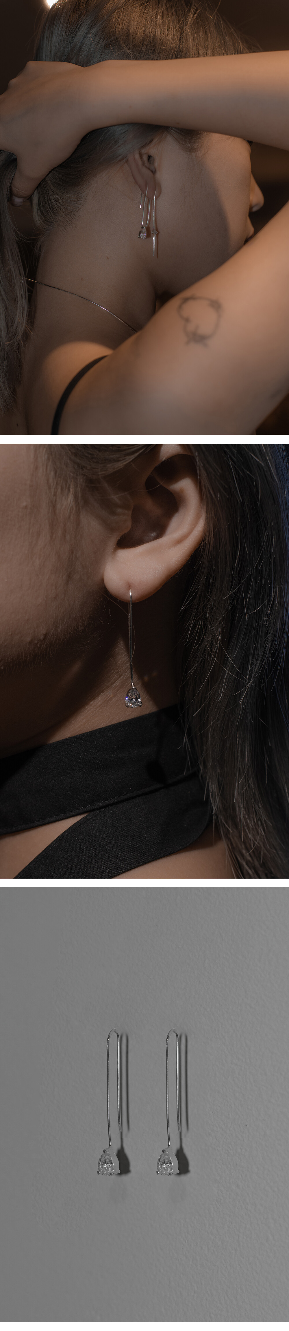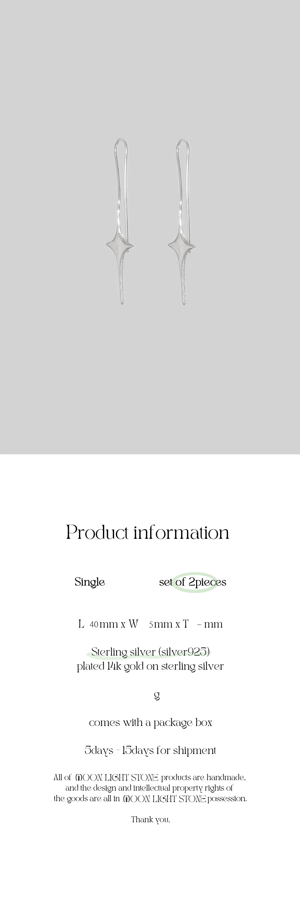 :빛을 모티브로 한 이어링 1pc , 물방울 모양의 스톤 이어링 1pc가 한 세트인 상품입니다.