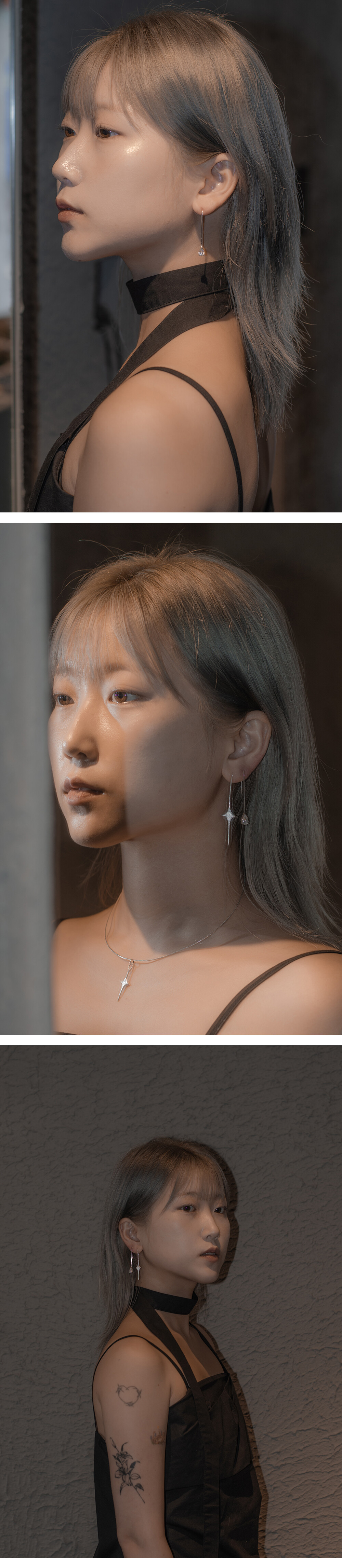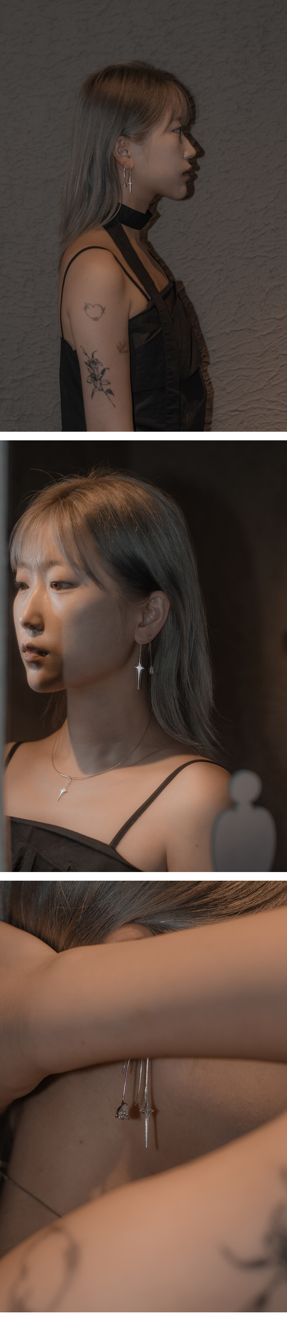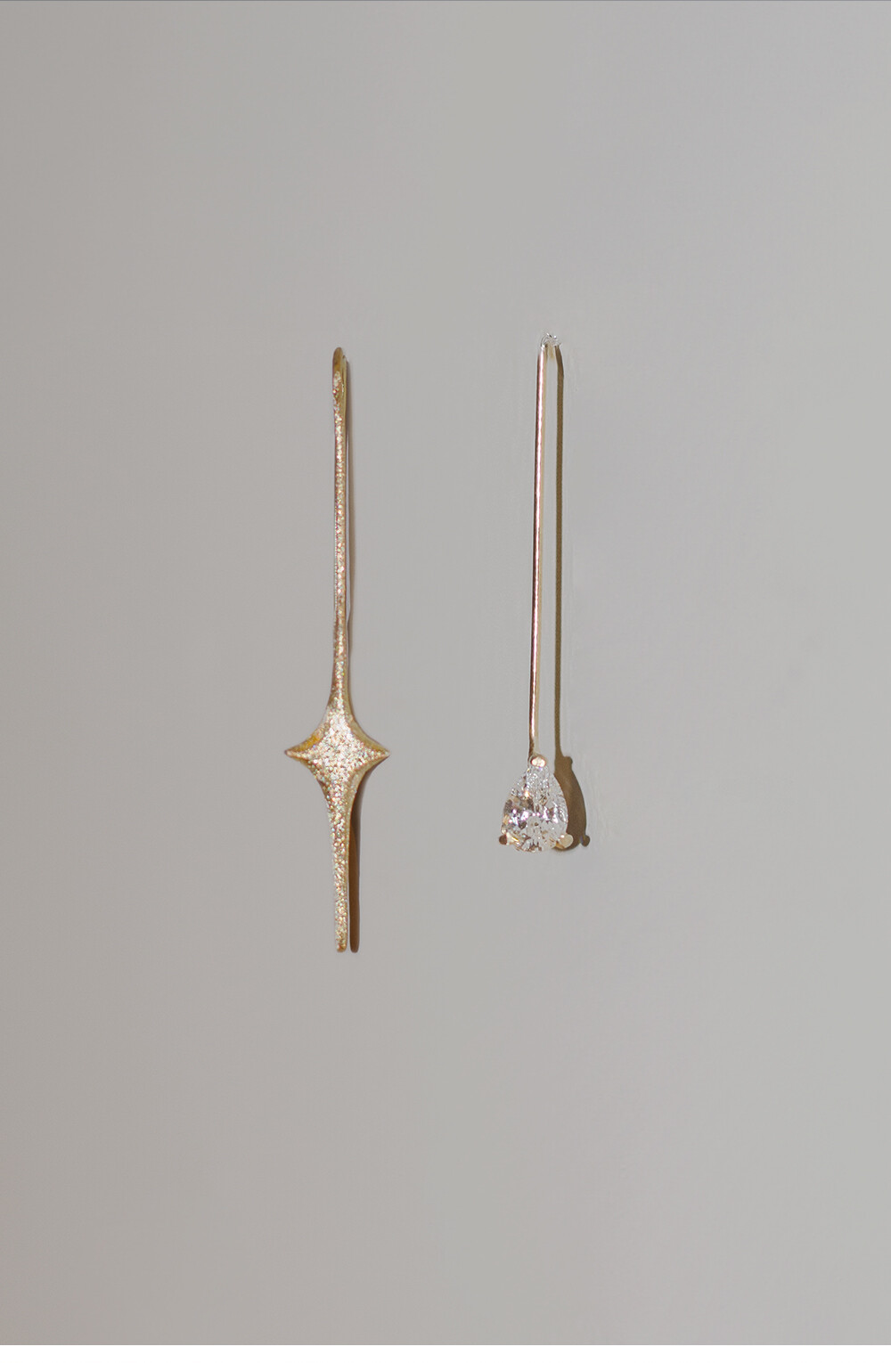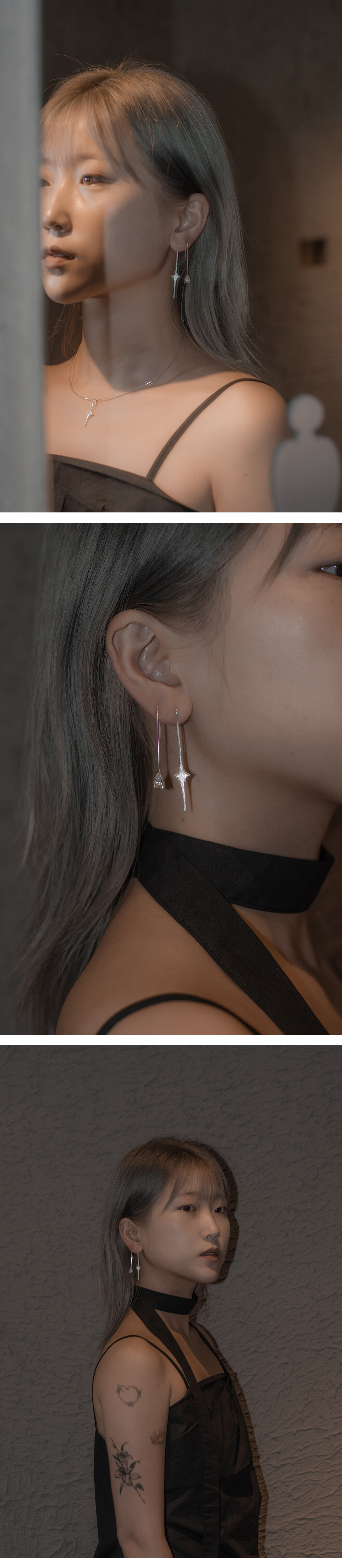 :빛을 모티브로 한 이어링 1pc , 물방울 모양의 스톤 이어링 1pc가 한 세트인 상품입니다.