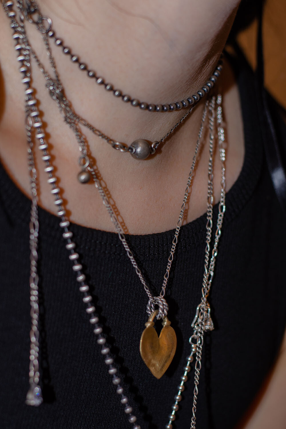 :50cm의 휘게로 체인 사이에 피시 후크 잠금장식을 걸어 어디들 착용이 가능한 제품입니다.